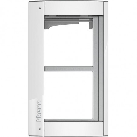 Emballage: 1 - 1 - 8 Marque: BticinoRéférence: 350222EAN: 8005543457535Description: Vidéoparlophonie - Cadre avec support 2 modules All White