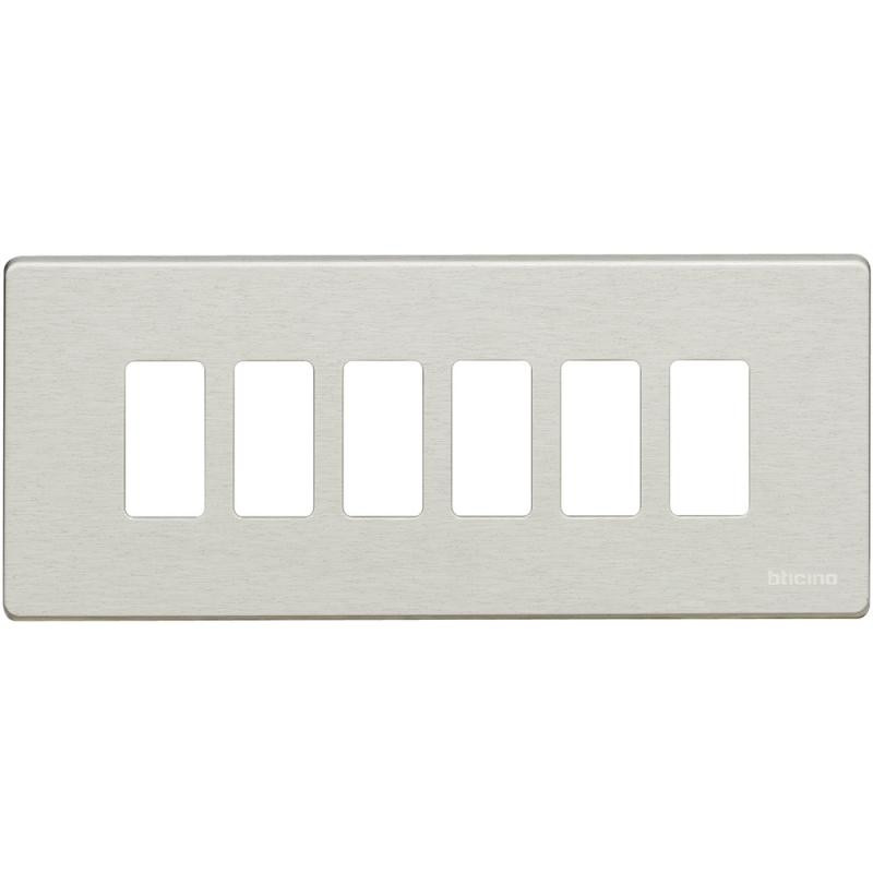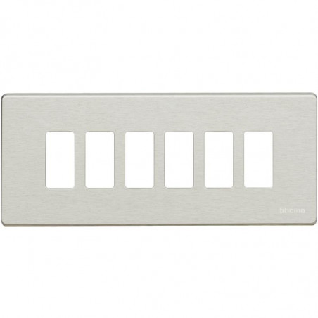 Emballage: 5 - 5 - 90 Marque: BticinoRéférence: 506L/6/XEAN: 8012199491394Description: Plaque de recouvrement Magic - 6 modules - pour support réf. 506S - Oxydal