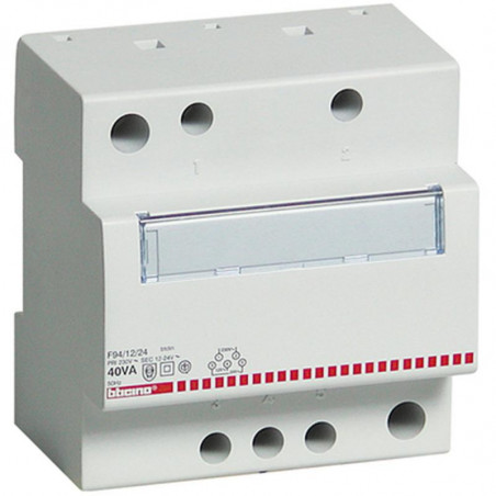 Emballage: 1 - 12 - 336 Marque: BticinoRéférence: F93/12/24EAN: 8012199130040Description: Transformateur IP 20 - 230 V - 25 VA - 4 modules DIN