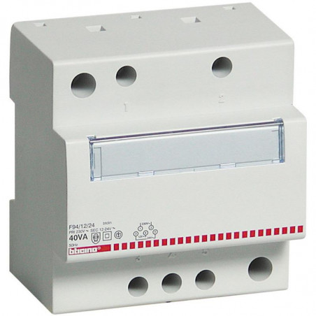 Emballage: 1 - 6 - 168 Marque: BticinoRéférence: F94/12/24EAN: 8012199130064Description: Transformateur IP 20 - 230 V - 40 VA - 5 modules DIN