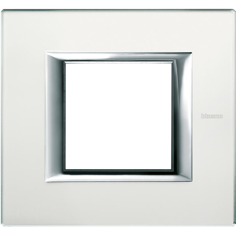 Emballage: 1 - 1 - 27 Marque: BticinoRéférence: HA4802VSAEAN: 8012199789675Description: Plaque rectangulaire Axolute - verre miroir dépoli - 2 modules - 104 x 95 mm