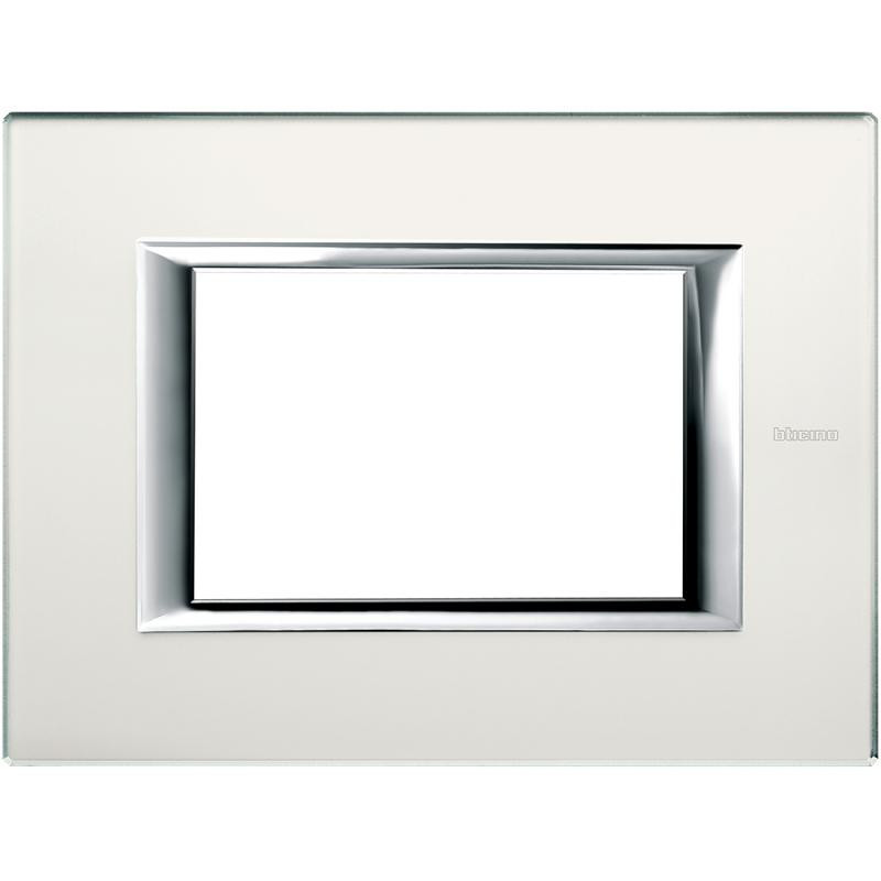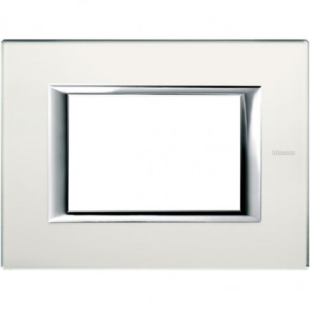 Emballage: 1 - 1 - 24 Marque: BticinoRéférence: HA4803VSAEAN: 8012199758527Description: Plaque rectangulaire Axolute - verre miroir dépoli - 3 modules - 127 x 95 mm