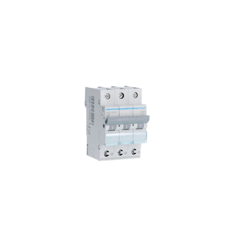 Emballage: 1 - 4 - 48 - 1152 Marque: HagerRéférence: MWS332AEAN: 3250614342257Description: Disjoncteur 3kA - C - 3P - 32A - 3M. - quickconnect