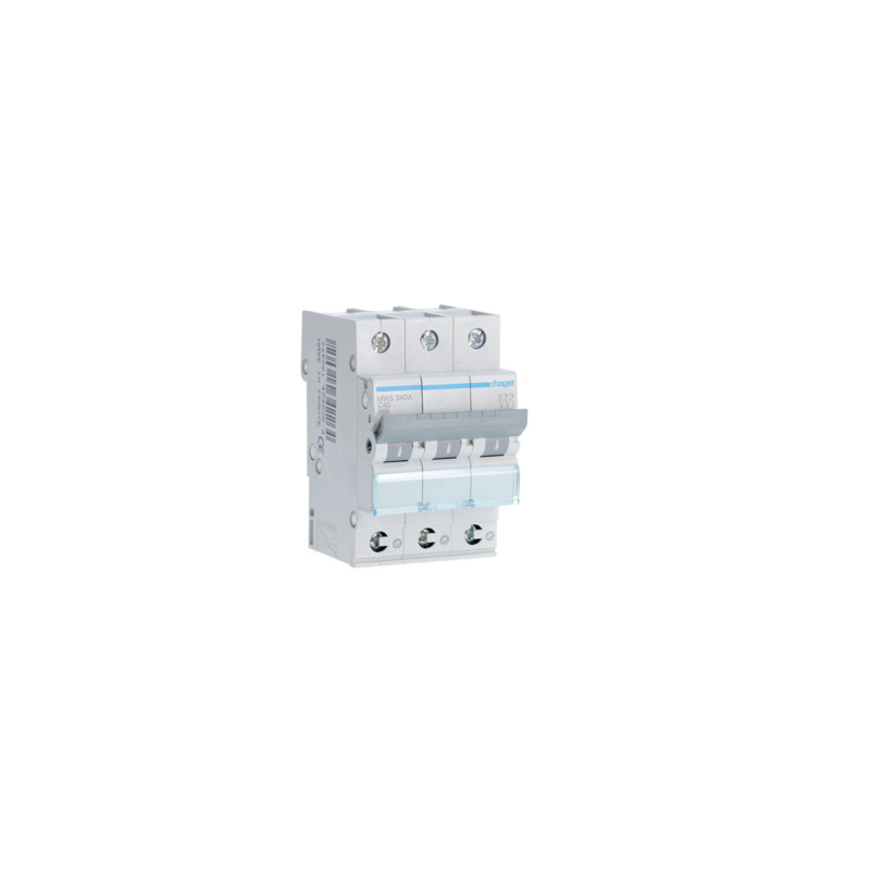 Emballage: 1 - 4 - 48 - 1152 Marque: HagerRéférence: MWS340AEAN: 3250614342264Description: Disjoncteur 3kA - C - 3P - 40A - 3M. - quickconnect