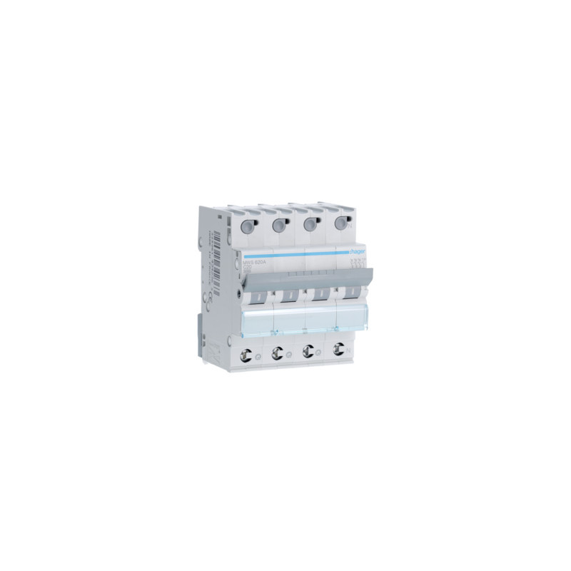 Emballage: 1 - 3 - 36 - 864 Marque: HagerRéférence: MWS620AEAN: 3250614342363Description: Disjoncteur 3kA - C - 3P+N - 20A - 4M. - quickconnect