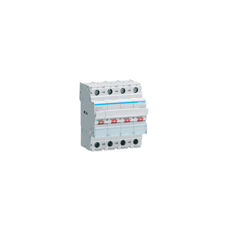 Emballage: 1 - 1 - 36 - 864 Marque: HagerRéférence: SBN440EAN: 3250615510198Description: Interrupteur modulaire 4 pôles 40A