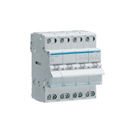 Emballage: 1 - 1 - 36 - 864 Marque: HagerRéférence: SFT440EAN: 3250615510945Description: Inverseur modulaire 4 pôles 40A, point commun amont, I-0-II