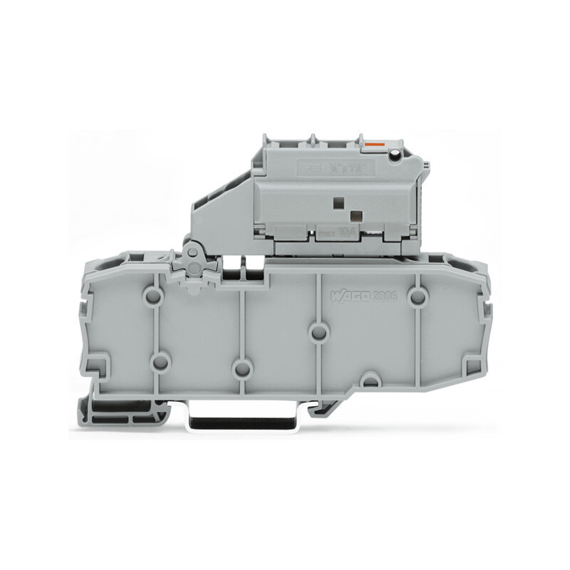 Borne à fusible pour 2 conducteurs avec porte-fusible pivotant avec plaque d'extrémité, gris