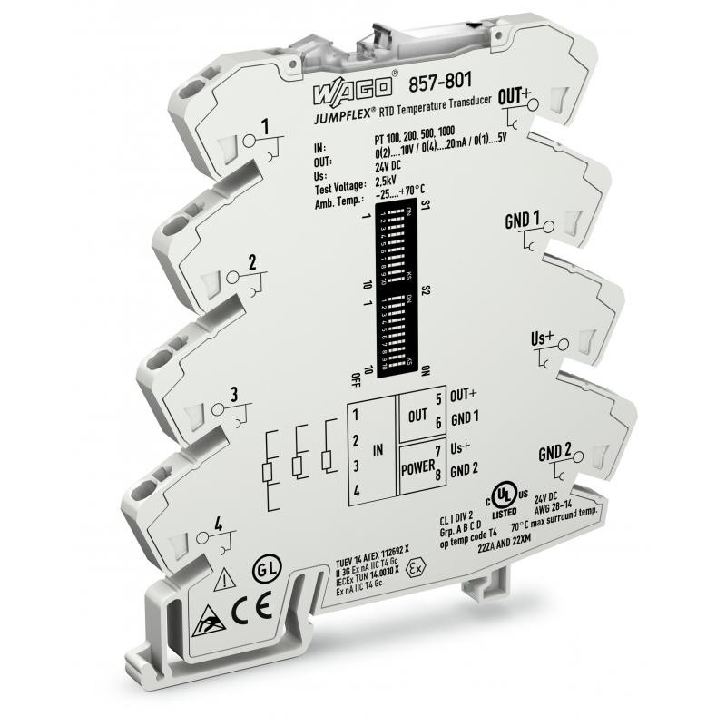 Emballage: 1Marque: WagoRéférence: 857-801EAN: 4045454502713Description: RTD-TRANSDUCER UI, gris clair