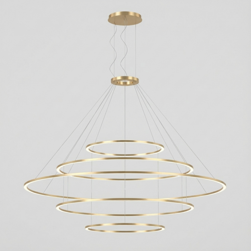 Description: Pendant Circular Outward 5 Rings (ø1200 ø2000 ø3000 ø2000 ø1200) LED 575W 4000K DALI Gold 49034lm