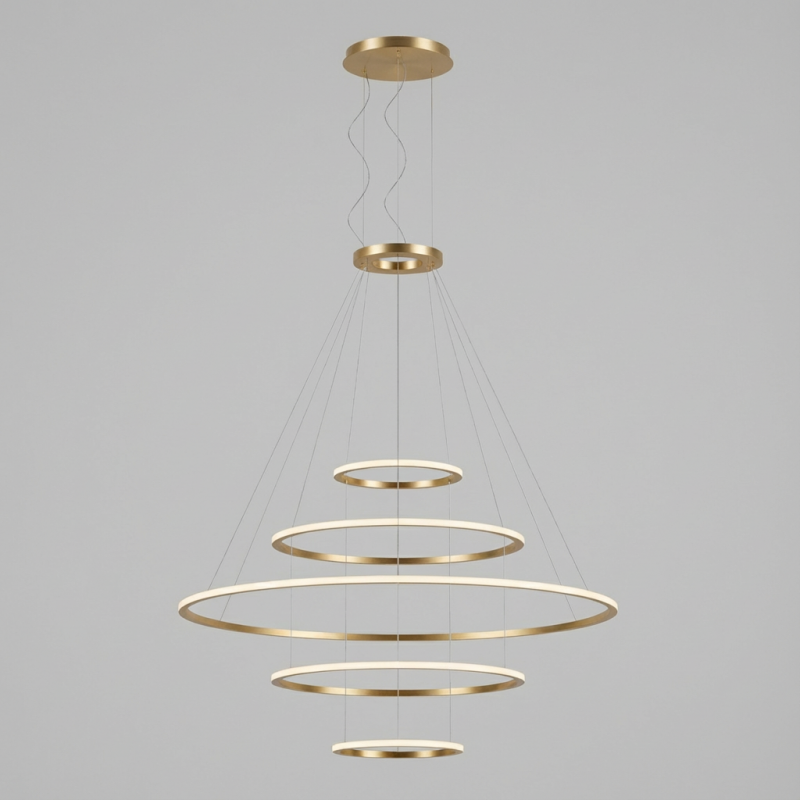 Description: Pendant Circular Outward 5 Rings (ø600 ø1200 ø2000 ø1200 ø600) LED 340W 3000K DALI Gold 27873lm