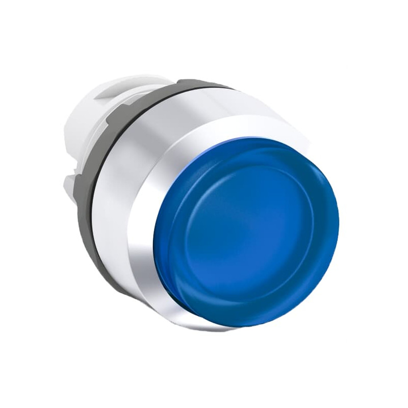 Description: BOUTTON POUSSOIR SAILLANT SÉRIE MODULAIRE ACCROCHAGE, LUMINEUX, COLLERETTE CHROMÉ, BLEU