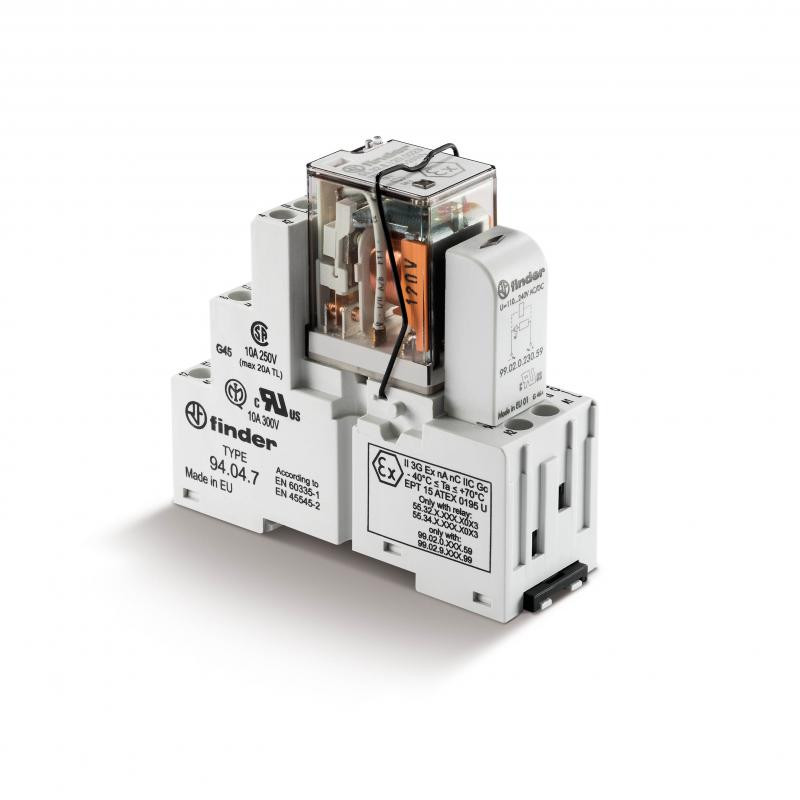 Description: Interface modulaire à relais 4RT 7A 120V AC, idéal pour l'interfaçage de sorties d'automate, étrier métallique, bornes à cage, module de présence tension et protection bobine, LED et indicateur mécanique, ATEX