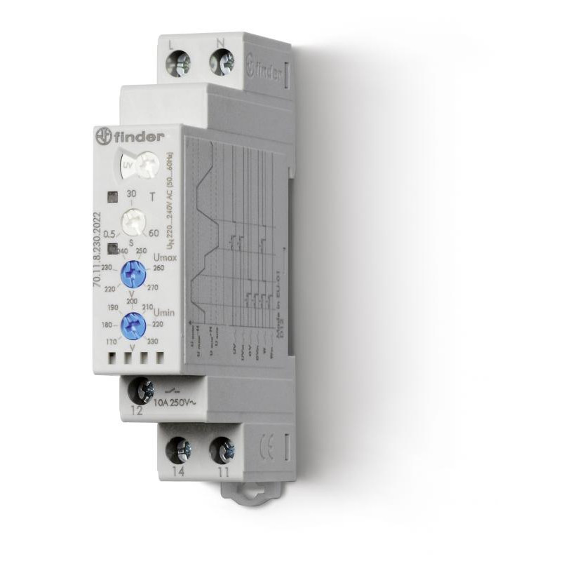 Description: Relais de contrôle de tension monophasé 1RT 10A 220 à 240V AC, mutifonction contrôle sous tension / surtension, mode fenetre, ordre / perte de phase , 2 valeurs réglables, retard à la coupure réglables, programmable