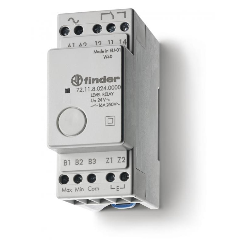 Description: Relais de contrôle de niveaux pour liquides conducteurs 1RT 16A 24V DC, matériau des contacts AgCdo, sensibilité fixe de 150 KOHMS, double temporisation, fonctions vidange et remplissage