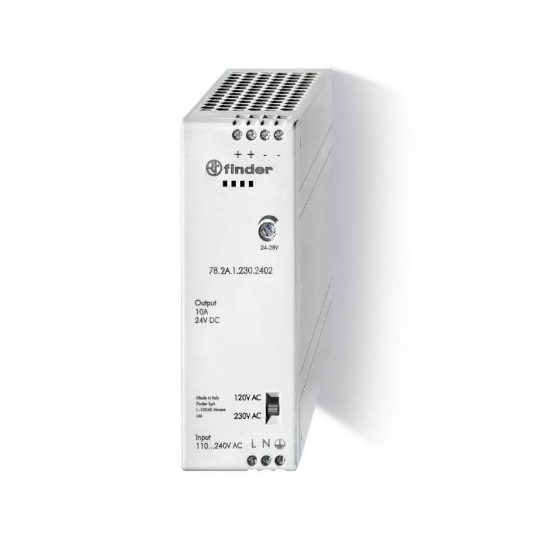 Description: Alimentation industrielle entrée 120 ou 240V AC sélectionnable, Sortie 24...28VDC 240W 10A montage sur rail 35mm