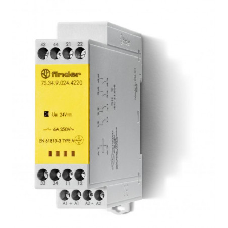 Description: Relais modulaire à contacts guidés liés mécaniquement 2NO + 2NC 6A 12V DC, pour application de sécurité, matériau des contact AgSnO2, bornes à cage, SIL2