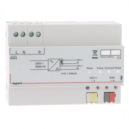 Emballage: 1 - 20 - 200 Marque: LegrandRéférence: 003507EAN: 3414972052405Description: KNX - Alimentation 640mA 7 DIN