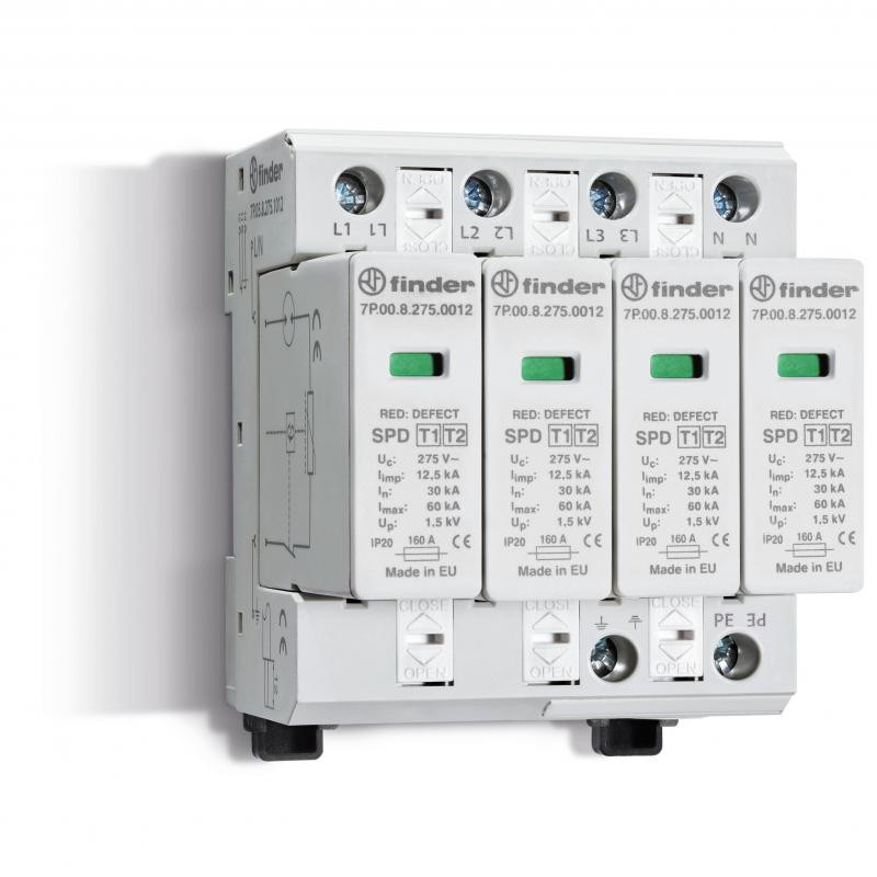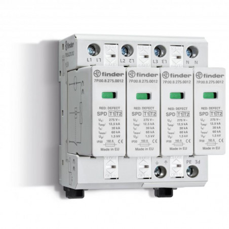 Description: Parafoudre T1+2 triphasé - L/PE - N/PE combinaison 4 varistors + éclateur Un=230VAC Uc=275VAC Iimp=12,5kA Up=1,5kV, modules interchangeables contrôle visiuel de l'état du varistor + Télésignalisation