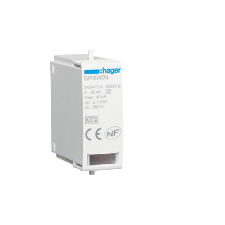 Emballage: 1 - 1 - 20 - 960 Marque: HagerRéférence: SPB040NEAN: 3250615515353Description: Cartouche neutre pr parafoudres débrochables 8,15,40 et 65 kA