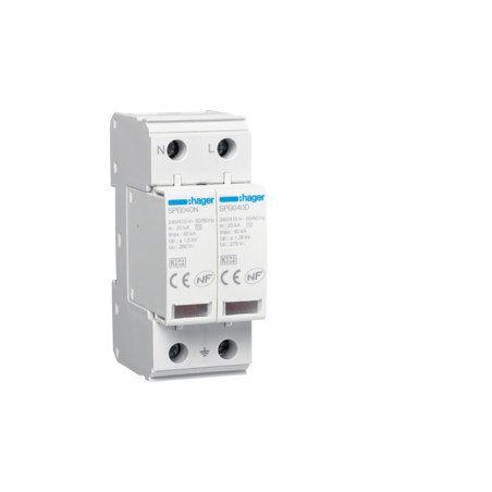Emballage: 1 - 1 - 42 - 1008 Marque: HagerRéférence: SPB240DEAN: 3250615515476Description: Parafoudre 40kA 2P avec indicateur de réserve