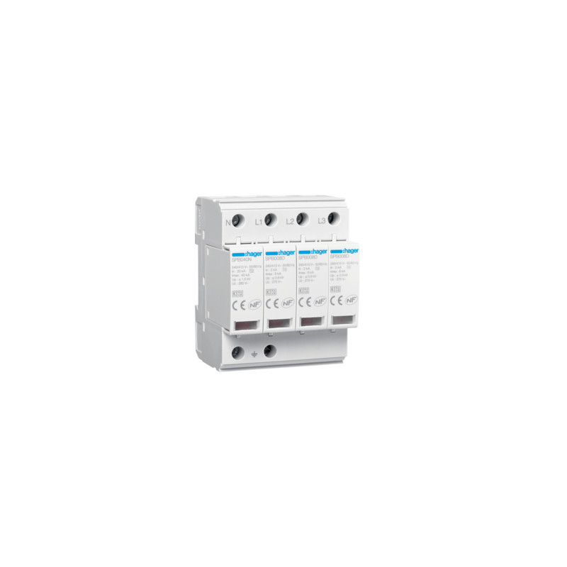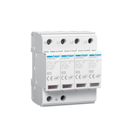 Emballage: 1 - 1 - 22 - 528 Marque: HagerRéférence: SPB408DEAN: 3250615515551Description: Parafoudre 4P débrochable 8KA type 2 avec indicateur de réserve