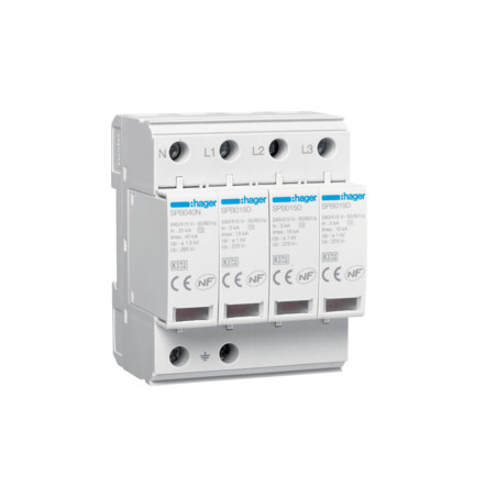 Emballage: 1 - 1 - 22 - 528 Marque: HagerRéférence: SPB415DEAN: 3250615515568Description: Parafoudre 15kA 4P avec indicateur de réserve