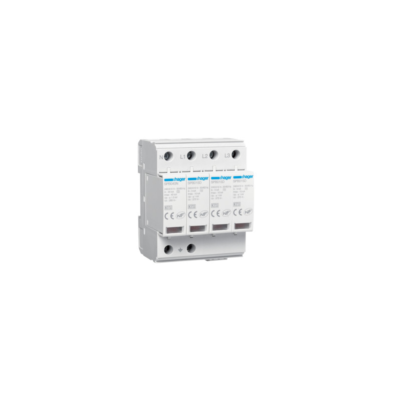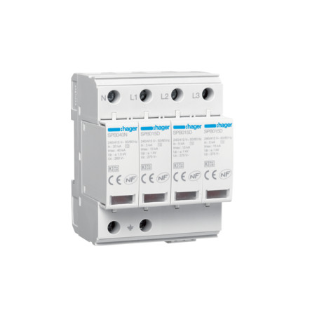 Emballage: 1 - 1 - 22 - 528 Marque: HagerRéférence: SPB415REAN: 3250615515575Description: Parafoudre 15kA 4P avec indicateur de réserve et télésignalisation