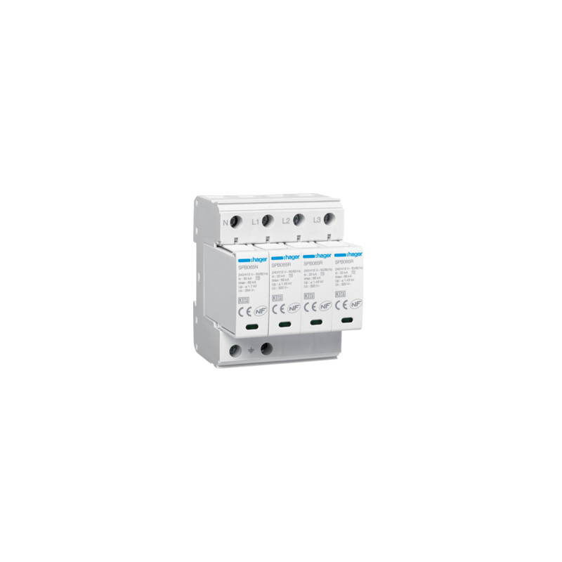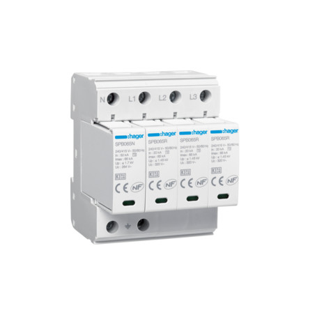 Emballage: 1 - 1 - 22 - 528 Marque: HagerRéférence: SPB465REAN: 3250615515605Description: Parafoudre 65kA 4P avec indicateur de réserve et télésignalisation