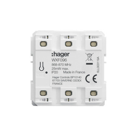 Emballage: 1 - 1 - 108 - 2592 Marque: HagerRéférence: WXF096EAN: 3250618504064Description: Poussoir 6 touches RF