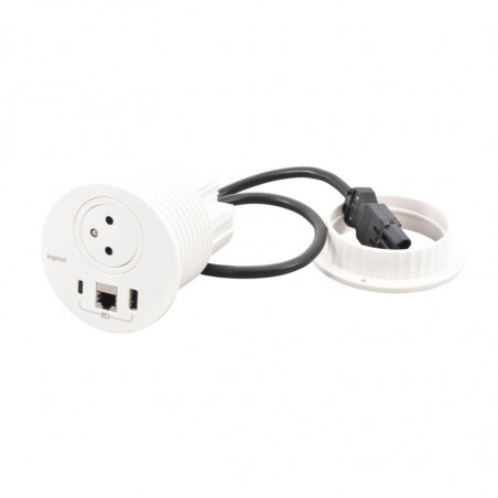 Description: Incara Disq 80 - blanc - équipé de 1 prise FB + 1 chargeur USB A+C 15W + 1 RJ45 cat6 FTP et un cordon de 0.5m avec fiche GST18
