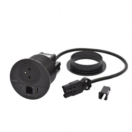 Description: Incara Disq 80 - noir - équipé de 1 prise FB + d'un chargeur USB A+C 15W + un passe-câble et un cordon de 0.5m avec fiche GST18
