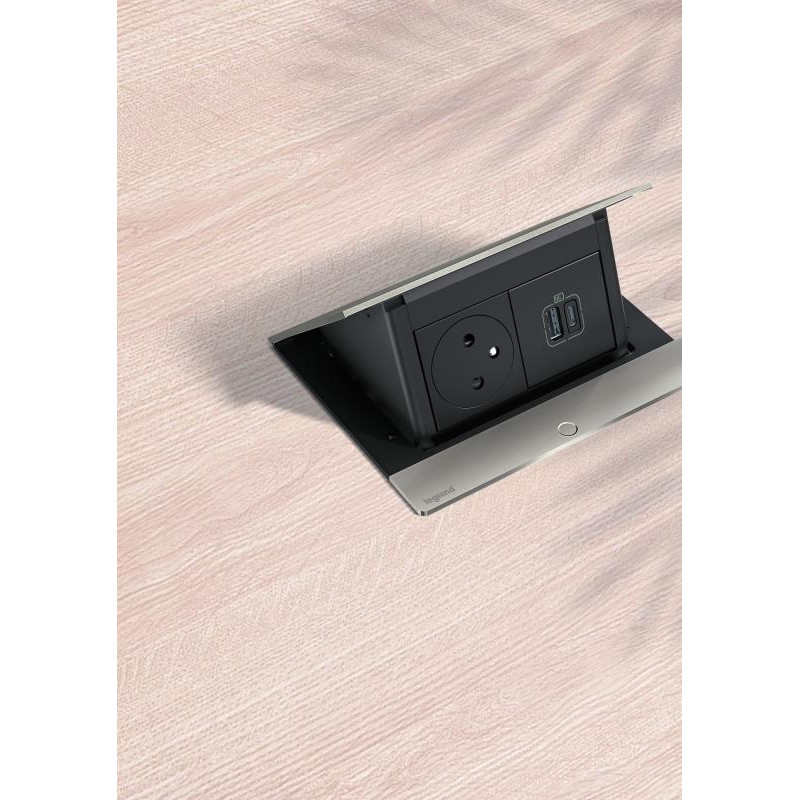 Description: Incara Pop Up - inox - 2x4 modules - equipé de 2 prises FB + 2 chargeur USB A+C 15W et un cordon de 2m avec fiche