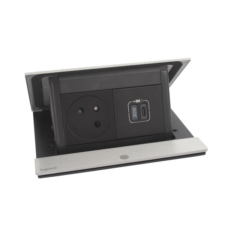 Description: Incara Pop Up - inox - 4 modules - équipé de 1 prise FB + 1 chargeur USB A+C 30W et un cordon de 2m avec fiche