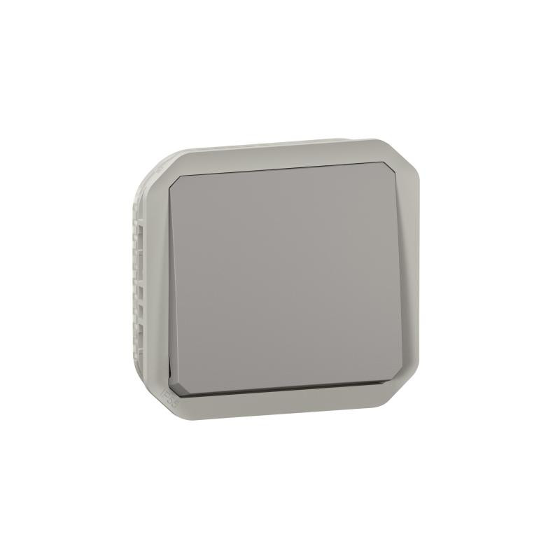 Description: Plexo poussoir NO 10 A - 250 V - livré sans boîte de montage en surface ou cadre encastré - IP55 IK08 - gris