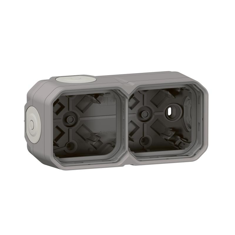 Description: PLEXO boîtier à embouts - 2 poste horizontaux ou verticaux - 3 entrées simple en 1 entrée double - embouts à membrane - IP55 IK08 - gris