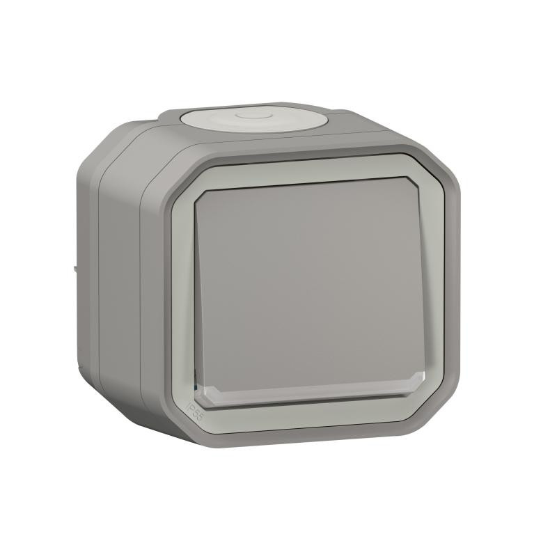 Description: Plexo interrupteur deux directions lumineux - 10 AX - 250V - livré complet avec boîte de montage - IP55 IK08 - gris