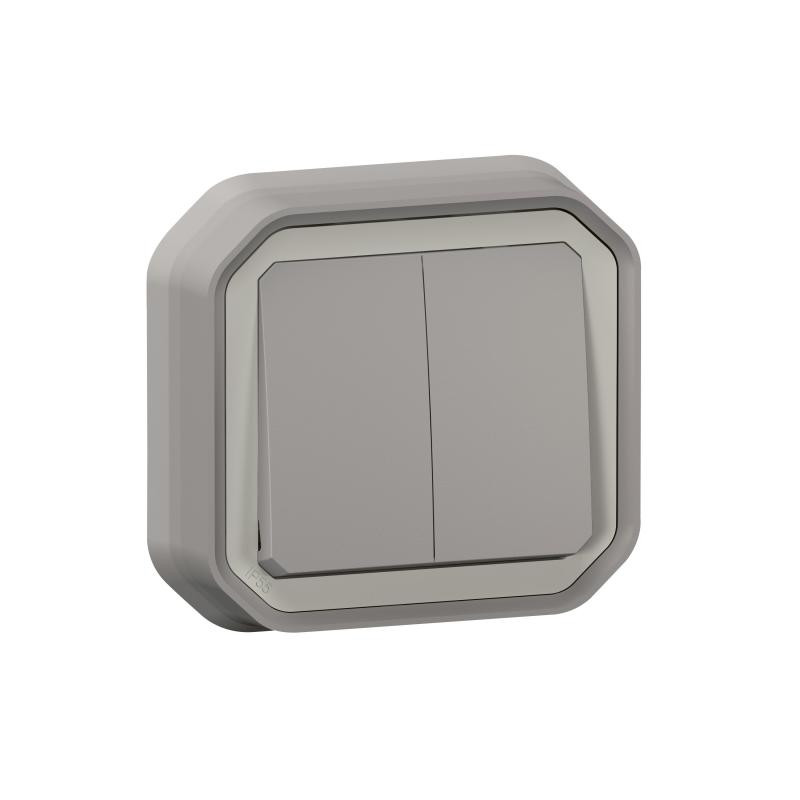 Description: Plexo double interrupteur deux directions ou poussoir inverseur - livré complet avec support plaques - IP55 IK08 - gris