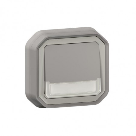 Description: Plexo poussoir contact NO lumineux - livré avec lampe 12V (230V possible) avec porte étiquette - encastré - livré complet avec support plaques - IP55 - IK08 - gris