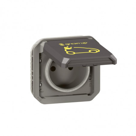 Description: PLEXO prise de courant 16A - 250V 2P+T - avec volet Green'up - pour la recharge d'un véhicule - mode 2 - livré sans boîte de montage en surface ou cadre encastré - IP55 - IK08 - anthracite