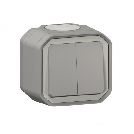 Description: Plexo GP double interrupteur deux directions ou poussoir inverseur - 250V - livré complet avec boîte de montage - IP55 IK08 - gris