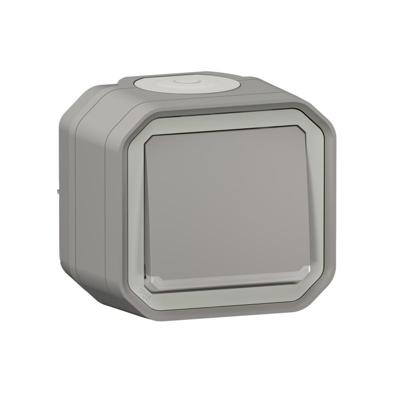 Description: Plexo GP poussoir simple lumineux - appareil complet - 10A - IP55 - gris