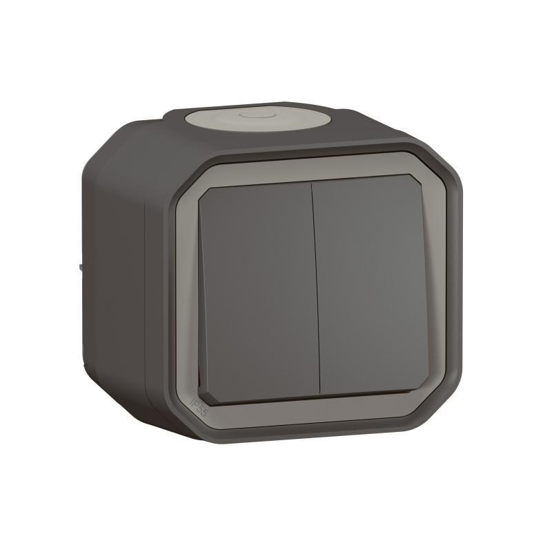 Description: Plexo GP double interrupteur deux directions ou poussoir inverseur - 250V - livré complet avec boîte de montage - IP55 IK0+A2:A518 - anthracite
