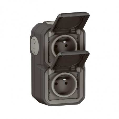 Description: Plexo GP double prise de courant à volet 2P+T - précâblée verticale - appareil complet avec boîte IP55 - anthracite