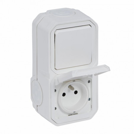 Description: Plexo GP inter 2 directions + prise de courant 2P+T à volet - verticale - appareil complet avec boîte IP55 - blanc