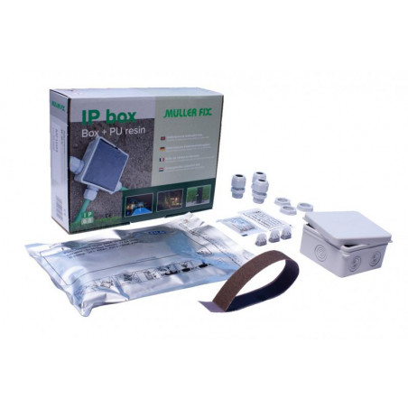 Description: Boîte de dérivation souterraine. Un kit facile et rapide. Contenu du IP BOX: 1x Boîte de dérivation 80 x 80 x 40 mm 1x Résine polyuréthane 2K 270 ml 3x Presse-étoupe M20 3x Contre écrous M20 3x Connecteur 1x Papier abrasif 1x Gants de protection 1x Chiffon nettoyante