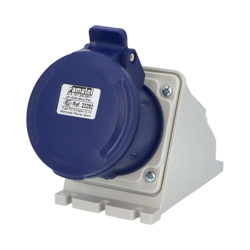Emballage: 2Référence: 23292Marque: FamatelRéférence fabricant: 23292EAN: 8429760217558Description: SPEEDPRO - PRISE MURALE 32A 3P 6H 230V IP54