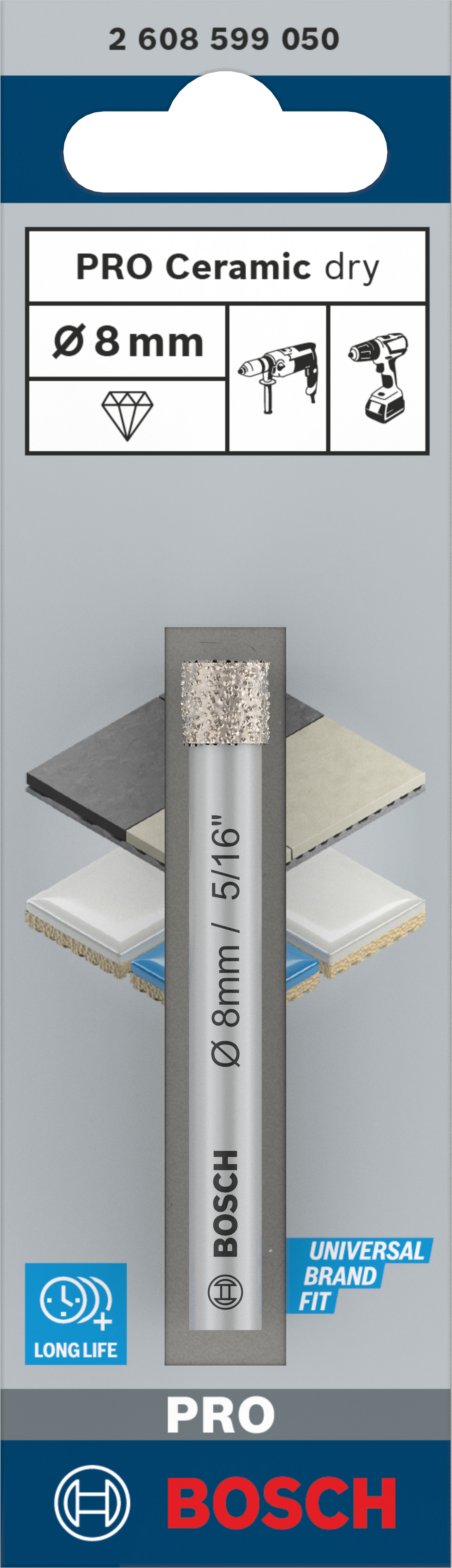 Emballage: 1Marque: BoschRéférence: 2608599050EAN: 6949509232960Description: Foret diamant PRO Ceramic a sec 8x66 mm