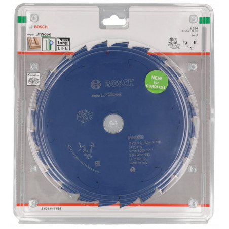 Emballage: 1 Marque: Bosch Référence: 2608644685 EAN: 4059952610962 Description: Lame de scie circulaire Expert for Wood pour scies sans fil 254 x 2,1/1,6 x 30 T24
