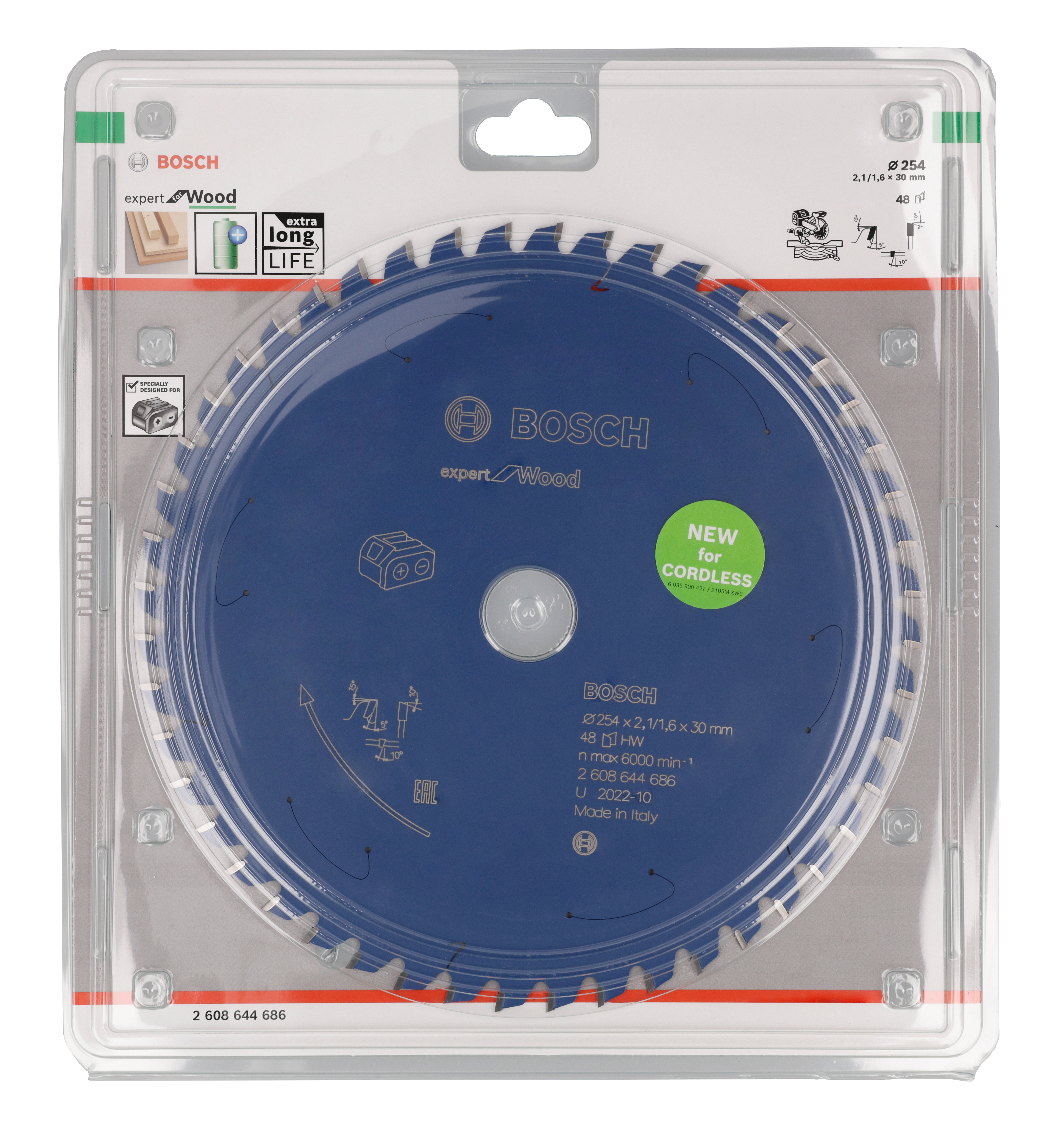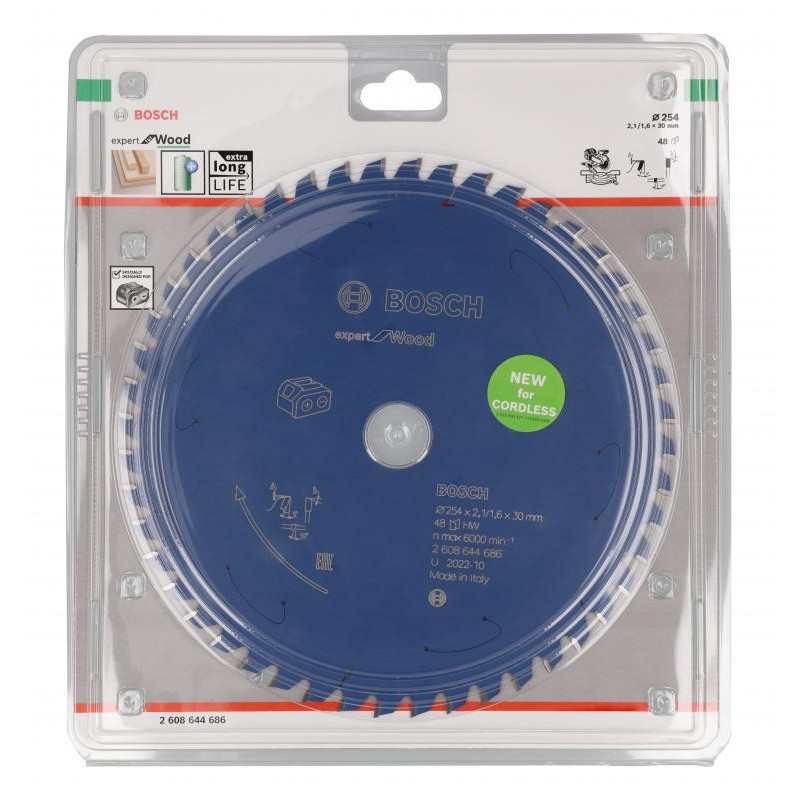 Emballage: 1 Marque: Bosch Référence: 2608644686 EAN: 4059952610979 Description: Lame de scie circulaire Expert for Wood pour scies sans fil 254 x 2,1/1,6 x 30 T48